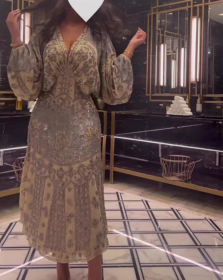 فستان الدانتيل الفرنسي بالتطريز الفاخر وياقة V